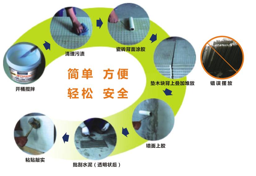①用棕毛刷或小滚筒将墙盾强力瓷砖粘结剂搅拌均匀后,直接涂刷在瓷砖背面,等其表面呈透明状后,用普通水泥或加入三分之一左右细沙搅拌成砂浆粘贴也可采用胶泥粘贴